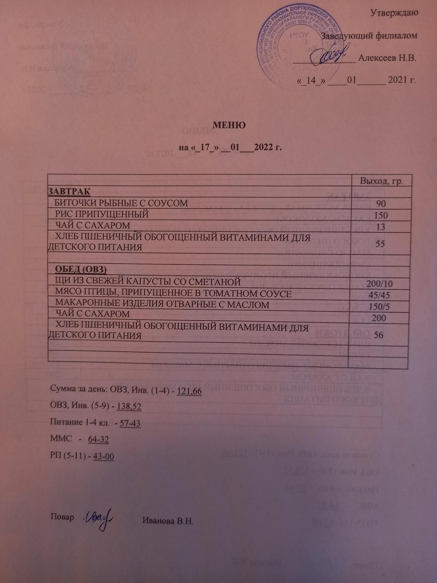 (Меню на 17.01.22 г. )